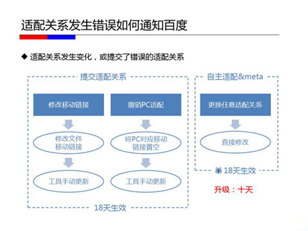 目前通過(guò)百度站長(zhǎng)平臺(tái)進(jìn)行移動(dòng)適配關(guān)系提交是大家選擇較多、也是效果最理想的方式。如果適配關(guān)系發(fā)生變化,除了修改適配文件外,記得一定要通過(guò)開放適配工具進(jìn)行文件手動(dòng)更新。