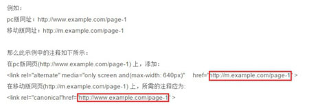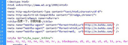META標(biāo)記這種適配方式也有不少的同學(xué)在操作,前提是你的頁(yè)面進(jìn)行了META標(biāo)記后必須被蜘蛛抓取識(shí)別后才能生效。一般情況下META標(biāo)記這種我們只要修改下新的路徑即可,如下圖只要在頁(yè)面內(nèi)把畫紅框部分的URL進(jìn)行變更即可,為了能夠更快的生效我建議在變更后使用sitemap等方式提交該類頁(yè)面,讓百度能夠更快的發(fā)現(xiàn)和更正適配關(guān)系。
