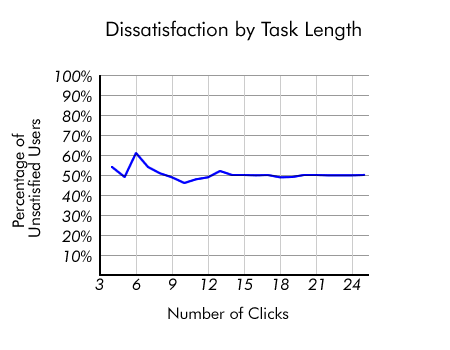如果我們看的任務(wù)大大超過(guò)三次點(diǎn)擊,我們看到用戶(hù)的滿(mǎn)意度下降了嗎?結(jié)束時(shí)的620個(gè)任務(wù),我們要求用戶(hù)如何滿(mǎn)足他們的網(wǎng)站的任務(wù)。再次,有各種各樣的答案,有時(shí)用戶(hù)非常滿(mǎn)意,其他時(shí)候他們完全不滿(mǎn)意。這些評(píng)級(jí)與點(diǎn)擊的數(shù)量了嗎?分析滿(mǎn)意度的數(shù)據(jù)后,我們?nèi)匀粵](méi)有發(fā)現(xiàn)證據(jù)的設(shè)定“三次點(diǎn)擊”的原則。當(dāng)我們看著用戶(hù)不滿(mǎn)意的比例,我們的數(shù)據(jù)顯示幾乎沒(méi)有變化之間不同的點(diǎn)擊流長(zhǎng)度。更少的點(diǎn)擊不讓用戶(hù)更滿(mǎn)意。
